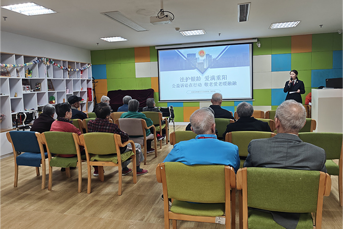 为扎实推进第十六个“敬老月”活动,切实增强老年群体的法治意识和自我保护能力。近日,钟楼区院公益诉讼检察部门干警走进辖区养老机构玖玖江南康养中心,开展以“法护银龄 爱满重阳——公益诉讼在行动 敬老爱老暖融融”为主题的普法宣传活动。